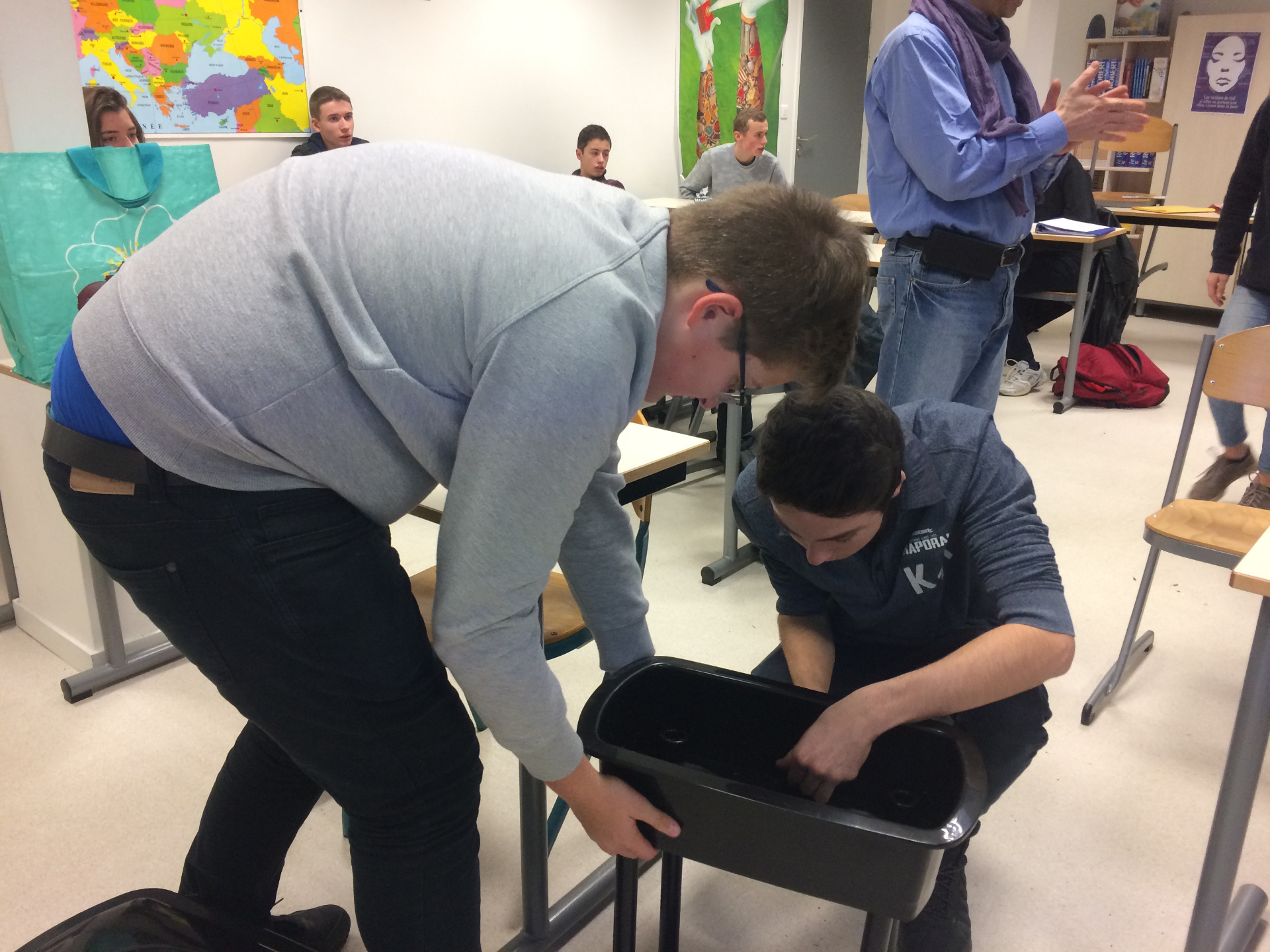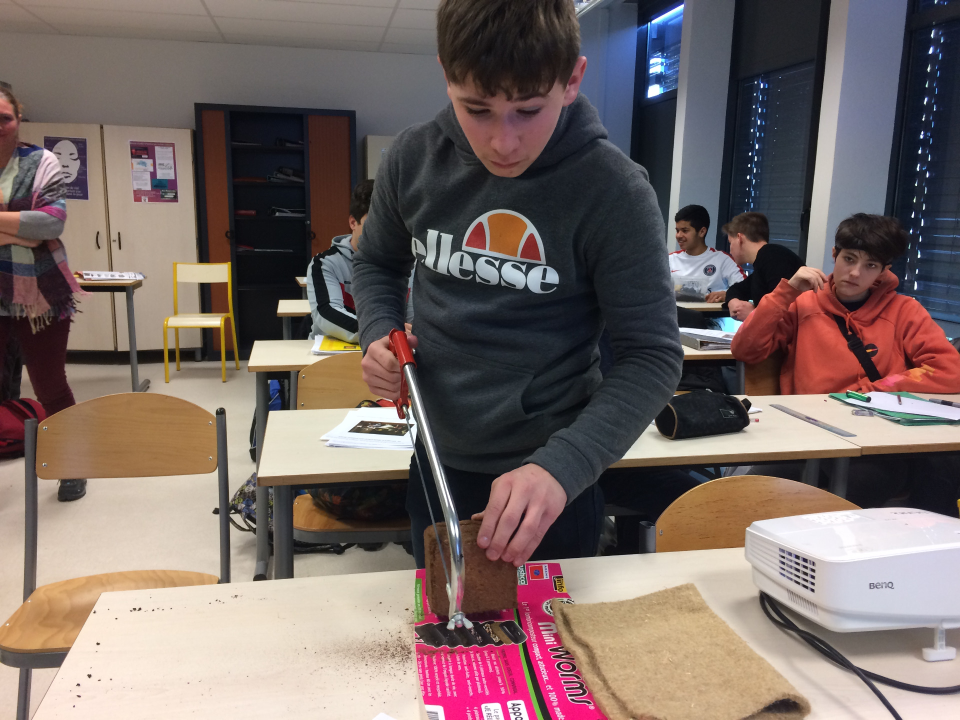 Nous avons monté tout d'abord les pieds, et placé le robinet sur le premier plateau. Il a fallu découper à la scie un bloc de substrat compacté de fibres de noix de coco que l'on a ensuite dissout dans l'eau afin d'obtenir une pâte qui servira de litière aux vers. Ensuite, nous avons placé les vers avec quelques aliments humides (peau de banane) afin de les nourrir petit à petit. Nous avons disposé du papier essuie-tout par-dessus et nous les avons recouverts d'un tapis d'humidification de fibres de noix de coco afin de maintenir l'humidité. Ce tapis devra être remplacé dès qu'il sera dégradé soit par un morceau de chiffon, du carton ou encore du papier journal. Il est important de savoir que les vers mangent la moitié de leurs poids chaque jour.